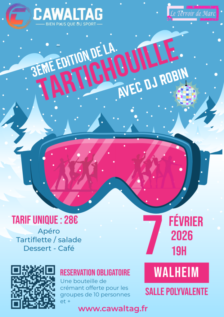 Tartichouille 2026 Les inscriptions à la soirée dansante Tartichouille du 07 février 2026 sont ouvertes ! Ne manquez pas cette super soirée et inscrivez-vous dès maintenant pour réserver votre table et votre place sur la piste de danse ! Je m'inscris